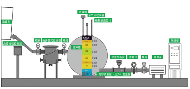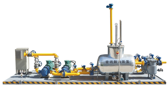 一、概述 目前在全國各地石油、石化、化工行業油罐車拉油生產過程中,絕大多數現場仍然采用傳統的敞口卸油方式,敞口卸油方式是收油方為防作弊的一種方法,現場管理者在敞口卸油時憑肉眼觀察油品質量,檢查油中是否摻水、是否摻雜質,以避免造成重大經濟損失。但是,敞口卸油油氣揮發容易引發爆燃,造成安全事故;而且敞口卸油使原油向外面噴濺,造成環境污染和空氣污染,有些卸油臺現場環境惡劣,工作人員長期呼吸有害物質極易致病。 針對此問題,我們設計出雙泵雙通道的密閉卸油裝置,該產品不僅僅能提產增效、大大加快卸油速度、雙雙過濾器式設計滿足現場不停車卸油當維護一臺過濾器時通過流程切換到另一過濾器。 圖1 密閉卸油裝置系統實物 本系統由防爆變頻柜、閉環控制系統、原油泵、緩沖罐、余氣回收裝置、電容式差壓(壓力)變送器、阻火單呼閥、快開籃式過濾器、蝶閥組成。 圖2 密閉卸油裝置原理圖 緩沖罐內頁面高度說明: 采用變頻器閉環控制模式,自動啟停輸油泵,根據液面的高低自動調節電機轉速。整個卸油過程無需人工操作,方便快捷。 整個卸油過程如下: 1、液位達到區域1后,變頻啟動。 2、液位在區域2時,變頻器進行高頻率高速運行。 3、液位在區域3時,變頻器進行頻率調節階段。 4、液位在區域4時,變頻器進行低頻低速運行。 5、液位在區域5時,變頻停機。 6、液位在區域6時,緊急停機。 二、產品特點 (1)雙通道式設計優勢 ① 雙通道式設計能夠滿足空間狹小,可利用空間小的基站,可同時滿足倆臺油車同時卸油,大大節約了時間提高了效率,雙過濾管的設計可在油品雜質較多的時候在不影響卸油的情況下進行切換清理。 ② 雙輸油管道泵的設計解決了因油泵檢修維護影響卸油的問題,一備一用。雙通道設計的優勢在于設備儀表(如含水分析儀,流量計等儀器)維修,更換過程中不影響生產,通過A組閥門與B組閥門及C組閥門之間的切換實現管路或輸油泵間的切換。 (2)空間優勢 ① 本產品優勢占地空間小,撬裝式設計,便于安裝,減少基礎施工帶來的成本高、施工時間長、安全隱患多等諸多問題,本產品上位機對整個卸油過程可進行控制及流量,含水,液位等狀態的顯示。 (3)安全環保,節約資源 ① 能夠徹底杜絕敞口卸油時油氣揮發引發的爆燃類安全事故。 ② 保持卸油臺清潔,防止環境和空氣污染,避免工作人員呼吸污染的空氣影響健康。 ③ 取消龐大的卸油槽,用卸油管線代替,可以節省大量資金。 ④ 減少現場管理者和取樣化驗的頻次,可以節省大量人力物力。 (4)提效務實 ① 大幅度提高卸油生產效率。原來敞口卸油時,由于司機擔心原油向外面噴濺而小開閥門放慢了卸油速度。密閉卸油后,司機不用擔心原油向外面噴濺,可以開大閥門,卸油速度大大加快。 ② 在密閉卸油狀態下靠技防措施監測進廠油品質量,做到自動測水報警滴水不漏,徹底避免肉眼觀察油品質量產生的失誤,從根本上避免了人為因素以水頂油弄虛作假的發生。 (5)專利認證 三、現場應用