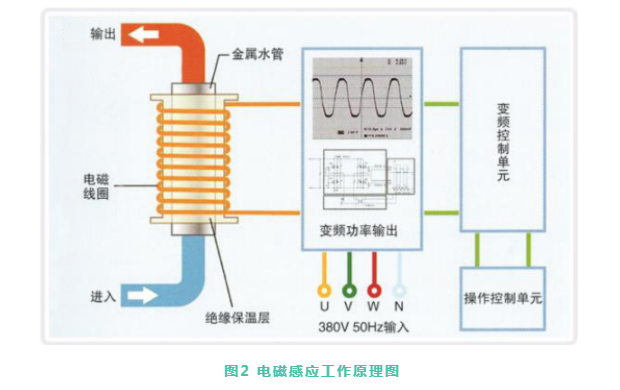 電磁感應工作原理:將電能轉換為熱能,在控制器內由整流電路將50Hz的交流電壓變成直流電壓,再經過控制電路將直接電壓轉換成頻率為22KHz的高頻交流電壓。高頻交流電壓流過纏繞在金屬材料管外的高頻導線,高速變化的磁場內部產生的磁力線切割金屬材料時產生無數小渦流,使金屬迅速加熱達到升溫,整個過程是“電-磁-熱”的高效轉換。