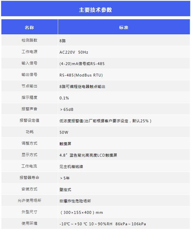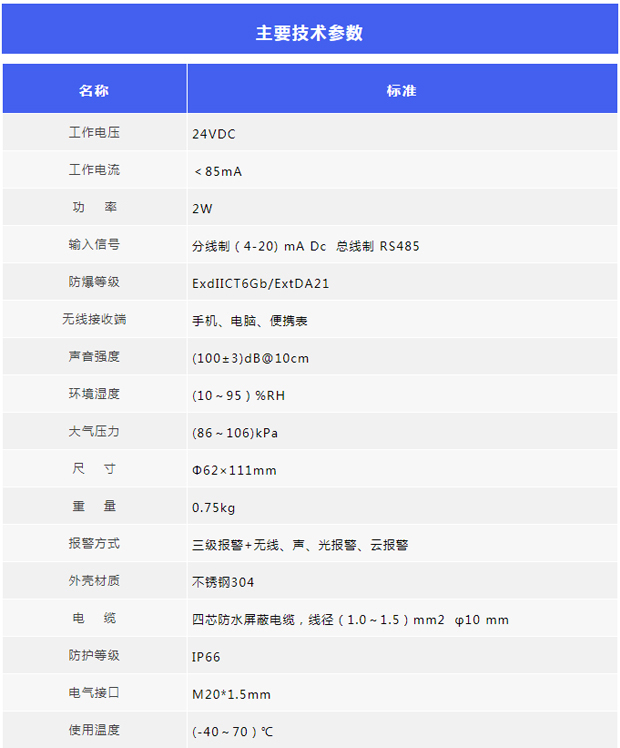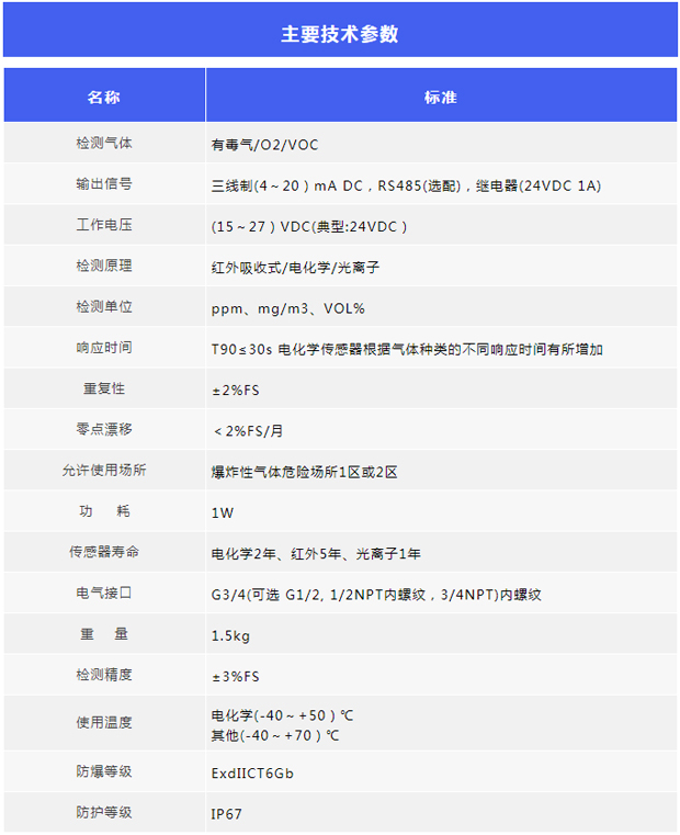 一、概述 有毒氣體報警器是用以檢測室內外危險場所的泄漏情況,是保證生產和人身安全的重要儀器。當工業環境中可燃或有毒氣體泄露,報警器檢測到氣體濃度達到爆炸或中毒報警器設置的臨界點時,探測器將氣信號轉換成電壓信號或電流信號傳送到報警儀表,以提醒工作人員采取安全措施,并驅動排風、切斷、噴淋系統,防止發生爆炸、火災、中毒事故,從而保障安全生產。 二、系統產品組成 1.有毒氣體探測器 該探測器采用隔爆與本質安全復合型結構,防爆等級為ExdibⅡCT6Gb。該產品適用于ⅡA、B、C級,溫度為T1~T6的可燃氣體或蒸汽與空氣形成的爆炸性混合物場所的1區、2區。可廣泛應用于各煉油廠、化工廠等一切易發生可燃氣體或毒性氣體泄漏的場所,并對這些場所進行長期不間斷監測。對應輸出(4~20)mA DC標準電流信號或RS485總線通訊,是保證生命安全及工廠安全的重要工業安全儀表。 2.互聯網便攜式氣體檢測預警儀 該預警儀采用隔爆設計,是一套移動式視頻氣體探測產品。本產品同時集成多通道氣體檢測、大功率泵吸、高清視頻、聲光報警等功能于一身,可通過無線方式進行報警網絡組建,真正實現視頻監控、報警監測、實時報警。 3.云防爆聲光報警器 該無線防爆聲光報警器是為了滿足聲光報警客戶需求,開發的一種支持數字、模擬信號采集的聲光報警產品,彌補沒有節電輸出功能的探測器產品不能配接聲光報警器的缺陷,該產品可以采集探測器輸出的RS485信號或(4-20)mA信號給聲光報警器,同時輸出(4-20)mA信號給報警器,并發射無線信號,使佩戴無線聲光報警器接收端的人員接收到報警信號,手機端可實時查看報警信息。云防爆聲光報警器可設置報警點,提供了3個可設置報警點,以保障人的生命安全。 4.氣體報警控制器KB-2000N KB-2000N可燃氣體報警控制器是根據國家標準而設計制造的新一代氣體報警控制器。該報警控制器主要應用于石油、化工、醫藥、城市煤氣、輸油氣管道、中轉站等有可燃氣體、毒性氣體的場所。
